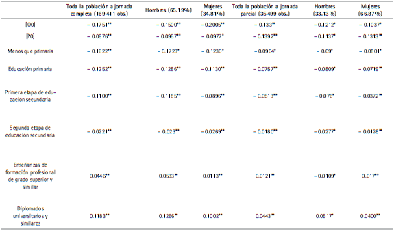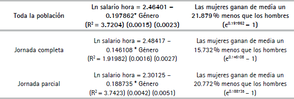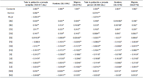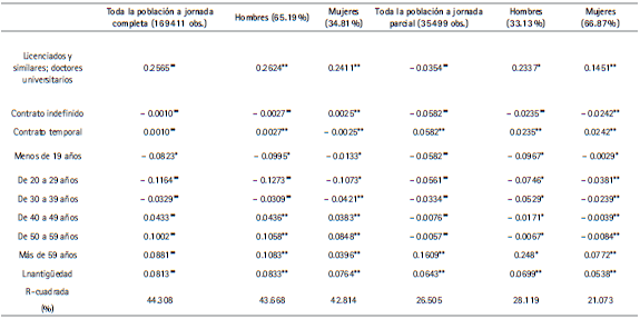 Del análisis de los descriptivos encontramos hechos que consideramos relevantes y que van a afectar a los posteriores resultados. Por ejemplo, la diferencia salarial media entre hombres y mujeres es sensiblemente superior en los contratos a tiempo parcial. Para este colectivo y respecto a la edad, observamos una población menor a 29 años y mayor a 50 predominante; proporciones mayores con estudios de primera etapa y significativamente menores, sobre todo en las mujeres, en “Licenciados y similares; doctores universitarios”. Además, el porcentaje de contratos indefinidos cae, sobre todo en los hombres. Igual ocurre con los porcentajes de “directores y gerentes”, “técnicos y profesionales científicos e intelectuales” y “otros técnicos y profesionales científicos e intelectuales”, que también caen para los trabajadores a tiempo parcial. Sin embargo, aumentan significativamente las trabajadoras “no cualificadas en servicios”. También la antigüedad en el trabajo es menor para este colectivo. Estos porcentajes o valores medios influirán en mayor o menor medida en la brecha salarial en función de los coeficientes beta que los acompañen en las ecuaciones de regresión.