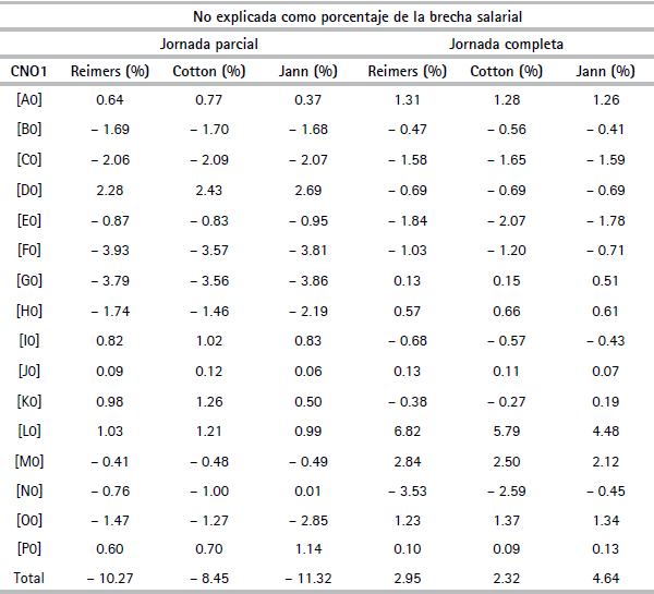 Respecto a la parte relativa a la discriminación, la ocupación que podemos señalar como más discriminatoria va a depender del método de descomposición de la brecha salarial utilizado (Reimers, Cotton o Jann). En el cuadro 5 presentamos los datos.