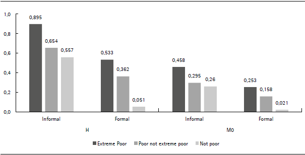 What is the relationship between multidimensional and income poverty in the CBA? Is the relationship different in informal settlements than in the rest of the city? To answer these questions Figure 2 shows, separately for formal and informal neighbourhoods, the value of each multidimensional poverty measure ( H or Mo) for people classified as extremely poor, poor but not extremely poor, and nonpoor according to the income-based poverty measure. The staircase pattern observed for both measures and in both types of neighbourhoods illustrates the positive correlation between multidimensional and income poverty. There is, however, a closer association between the two types of poverty in formal than informal neighbourhoods. While outside of the settlements, the extreme income poor are 10 times more likely than the nonpoor to be classified as multidimensionally poor, within the settlements, being extremely income poor increases the likelihood of being multidimensionally poor only by a factor of 1.6. In informal settlements, over half of the nonpoor based on income are classified as multidimensionally poor.
