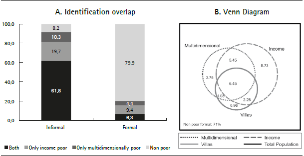 Do the two poverty criteria identify different people as poor? Figure 3a shows that the extent of identification overlaps between the two poverty measures (either nonpoor or poor by both measures) is 86% in the rest of the city, but only 70% in informal settlements. If poverty measurement were to be based only on income, 1 in 10 people in informal settlements would be incorrectly classified as nonpoor, whereas in the rest of the city the percentage of ‘missing multidimensionally poor’ is only 4%. These results are consistent with previous research showing a lack of overlap in terms of who is identified as poor using alternative poverty measurement approaches ( Ruggeri Laderchi et al., 2003) and recent research showing less identification overlap in the poorest countries ( Evans et al., 2020).