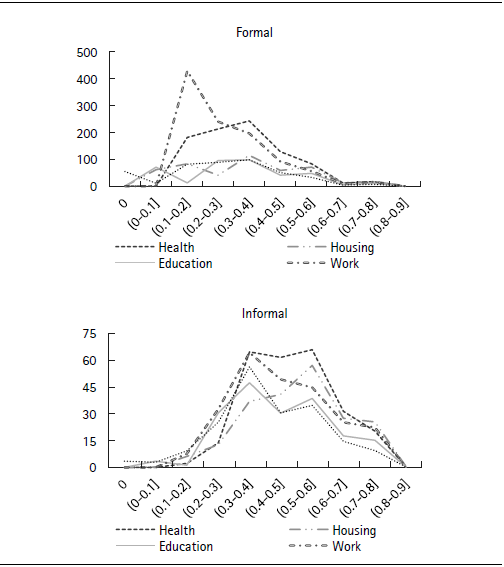 We conclude the analysis by examining the dimensional composition of multidimensional poverty and variations in poverty across population subgroups. Following Robes Aguilar and Sumner (2019), Figure 4 depicts the number of people in households deprived in each dimension (vertical axis) that simultaneously accumulate deprivations in each interval of the deprivation score ci (horizonal axis). In formal neighbourhoods, the frequencies of deprivations are low and nearly uniform across a wide range of values of c iin the housing and education dimensions and in income poverty, and are highest in the work and health dimensions. In fact, deprivations in work are most common among the nonpoor .ci between 0.1 and 0.2). In informal neighbourhoods, all dimensions are nearly equally relevant in explaining the accumulation of deprivations, but deprivations in health and housing are the especially frequent among highly deprived people (those with ci >0.50). In both formal and informal areas, deprivations in health are those most frequently experienced by people in house- holds with an intense clustering of disadvantage, an interesting result given the evidence on the role of health in poverty traps ( Marx et al., 2013).