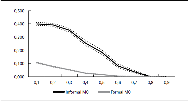 Figure 5 presents estimates of M0 for values of k ranging from .10 to .90. The difference in estimates of M0 between formal and informal neighbourhoods are large and statistically significant for all reasonable values of k; this result is insensitive to the poverty threshold. Robustness analysis of the overlap between multidimensional and income poverty shows that the ‘missing multidimensionally poor’ outside informal settlements are only a fraction of those within the settlements over all reasonable values of k (results provided upon request).