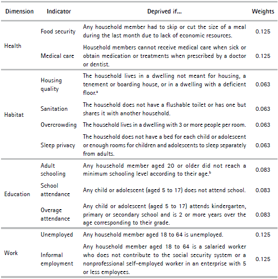The two indicators in the work dimension are unemployment and informal employment. Unemployment, Sen (2000) notes, can erode self-esteem and motivation, negatively impact mental and physical health, and aggravate relationships within the home due to the disruption of organized working life. Katzman (2001) asserts that the destruction of ties with the formal labour market weakens opportunities for social interaction with people from different classes, skills, or social contexts. The informal employment indicator adopts a legalistic definition classifying households with a salaried worker aged 18 to 64 who does not contribute to the social security system as deprived. Due to data limitations, for independent workers, we adopt a productive definition, based on education qualification and size of the enterprise ( Gasparini & Tornarolli, 2009). Nine Latin American countries include indicators of unemplo-yment and informal employment in their official MPIs ( Santos, 2019). 14