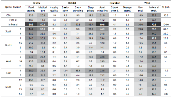 Table 2 presents a dashboard of deprivation rates for each of the indicators comprising the MPI-CBA for the CBA, formal and informal neighbourhoods, and each of the city’s districts grouped by zone. The grey scale gradients illustrate the marked spatial inequality in deprivations within the city, a pattern noted by other authors ( Macció & Lépore, 2012). The districts in the southern zone have the highest deprivation rates across all indicators, the northern districts have the lowest and the eastern, western, and central zones show intermediate rates.