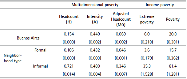 Table 3 shows the estimates of multidimensional and income poverty for the CBA and each type of neighbourhood. We find that 15.4% of the population of the CBA is multidimensionally poor. The incidence of multidimensional poverty is seven times higher in the informal settlements than in the rest of the city. The multidimensionally poor in informal settlements also experience a higher intensity of poverty (A): they are deprived, on average, in 48% of the weighted indicators, compared with 43% in the rest of the city.