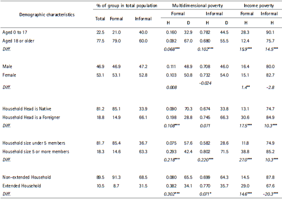The migratory status of the household head is one of the demographic characteristics that most clearly distinguishes formal from informal neighbour- hoods. Whereas 66% of the population of informal settlements has a foreign head of household (mostly from the poorer neighbouring countries of Paraguay and Bolivia), this group represents only 15% of the population in the rest of the city. Moreover, while in the rest of the city the rate of multidimensional poverty among people with foreign heads of household more than doubles that of rest of the population, in informal settlements the difference is not statistically significant. In the case of income poverty, the difference is statistically significant in both formal and informal areas, but the size of the absolute gap is larger in formal areas. The proximity to other foreign headed households might explain why migratory status loses its relevance as a risk factor for multidimensional poverty in informal settlements.