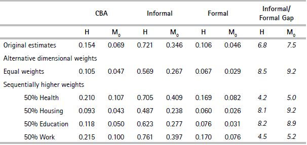 Table 5 presents estimates of H and M0 using two alternative weighting structures: a) equal indicator weighting, and b) sequentially increasing each dimensional weight to 50% and equally distributing the remaining weights. With all alternative weighting schemes, the large spatial gap in H and M0 remains. The size of the relative gap in M0 with the original weighting structure has an intermediate value and the gap is lowest when greater weight is given to health and work, the types of deprivation most prevalent outside the informal settlements.