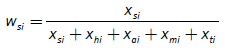 El cálculo de la proporción de cada producto en el portafolio exportador seleccionado para el año i se obtiene de la fórmula (8). Por ejemplo, la proporción del poroto de soja en un determinado año se define como ( w si).