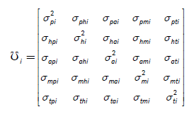 A partir de la fórmula (3) se procede a la confección de la matriz general de varianzas y covarianzas para cada año i. La misma debe cumplir con la característica de simetría, que su diagonal principal contenga las varianzas y el resto de los elementos las covarianzas 6.
