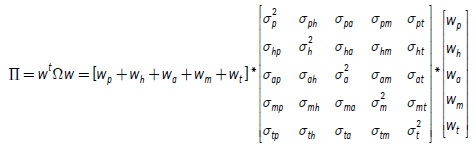 Siendo, w la participación de cada activo en la cartera; y Ω la matriz de varianzas y covarianzas, no singular, simétrica y definida positiva (véase ecuación [ 4]).