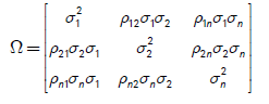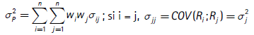 El primer paso en el análisis de riesgo de una cartera de inversión es considerar las varianzas y covarianzas de los activos que la componen para dar cuenta de los efectos de la diversificación. Se define como revela la ecuación (2).