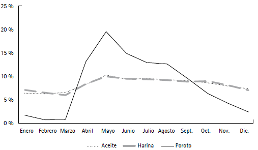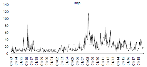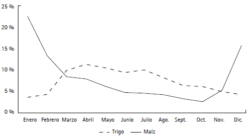 Los cálculos del VaR se realizan de forma diaria para dar cuenta de los efectos de volatilidad. No obstante, para una mejor representación en escala se los expresa en términos mensuales al multiplicar por la raíz cuadrada de 22, siendo la cantidad de días de operación bursátil en un mes. Se toma la decisión metodológica de expresar los resultados de forma mensual dado que tanto el aceite como la harina de soja, que representan el 50 % del portafolio exportador aquí elegido, presentan exportaciones constantes a lo largo del año a diferencia de lo que sucede con el poroto de soja, tal como se muestra en la figura 6. Al mismo tiempo, el trigo al ser un cultivo de invierno tiene alta participación en los meses de baja intensidad para los cultivos de verano como el maíz (véase figura 7). Esto sustenta la necesidad de contar con la medición en una frecuencia mensual.