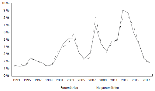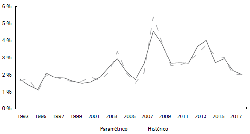 No obstante, tal como se evidencia en la figura 8 los métodos de estimación difieren en los años de mayor volatilidad. El método paramétrico subestima la volatilidad observada en los registros de alta volatilidad, mientras que el método histórico da cuenta de los mismos. Esto es importante para futuras líneas de investigación que incluyan una estimación prospectiva. Si se utilizan funciones de densidad normales es posible que los eventos extremos sean subestimados en aquellos años que resultan más relevantes para el cálculo de riesgo.