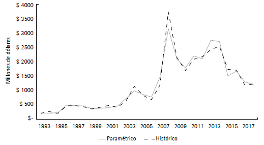En la simulación no paramétrica se trabaja con el mismo nivel de significancia y se realiza una estimación año a año tomando en cuenta los retornos diarios del portafolio definido en la ecuación (8)7. Este método es particularmente importante debido a que no realiza un supuesto sobre la distribución de los retornos, sino que los toma como datos del pasado. El resultado final de ambos métodos se compara con el total exportado para indicar la pérdida de ingresos potenciales que se podría superar en condiciones normales de mercado dentro del plazo del mes analizado bajo los supuestos especificados.