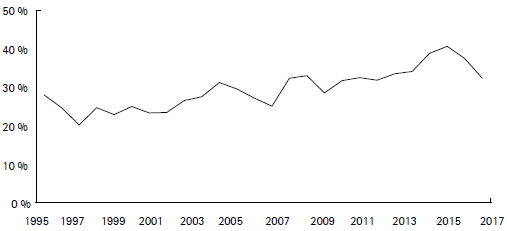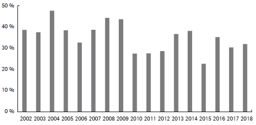 Para evaluar la representatividad de este portafolio seleccionado según los criterios indicados en el apartado II.B, se presenta en la figura 3 una serie que muestra su peso en el total de las exportaciones argentinas. Para el período 1993-2003 se tiene un promedio de 25 % en el total exportado, mientras que el promedio 2004-2018 es del 33 %, alcanzando registros más altos en los últimos años analizados.