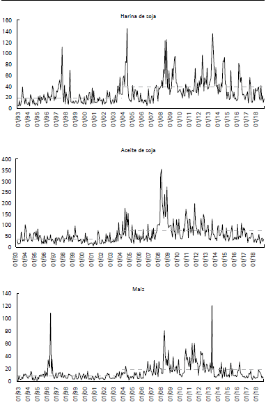 La serie de tiempo abarca una muestra de 6564 precios diarios para cada uno de los commodities seleccionados. Siguiendo la metodología de Gorton y Rouwenhorst (2006) y Bhardwaj et al. (2015) se seleccionó el primer futuro disponible para realizar la serie empalmada de los futuros. Todos los precios fueron descargados de Reuters. Para los productos del complejo sojero y maicero se utilizó como referencia el mercado de Chicago y para el trigo el de Kansas. Debido a que sus precios se expresan en diversas unidades de medidas se procedió a ejecutar una conversión métrica para unificarlos en dólares por tonelada. Finalmente, para el armado de las cantidades exportadas de cada uno de ellos se obtuvieron datos de la United Nations Comtrade Database.