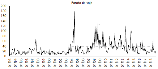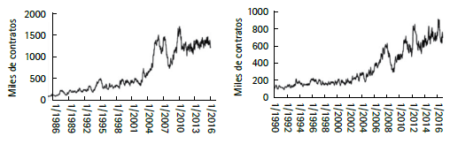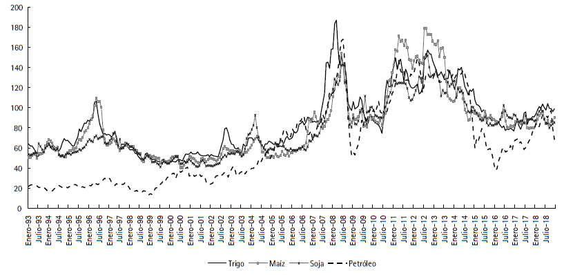 En el marco del proceso de financiarización y como consecuencia del mismo se ha ampliado la volatilidad de precios de bienes primarios. Los futuros de los commodities agrícolas experimentaron un crecimiento acelerado en la cantidad de contratos abiertos desde el año 2004 como se muestra en la figura 1. Puntualmente en los casos del poroto de soja y el maíz, solo en Chicago Mercantile Exchange aumentaron un 200 % desde el 2004 hasta finales del 2018, aun teniendo en cuenta el impacto de la crisis financiera internacional del 2008. Al mismo tiempo, en Rondinone (2019) se estimó un incremento de la presión especulativa en ambos commodities medida por el speculative index, con un aumento desde el 26 % registrado en el período 1990-2003 al 32 % durante el período 2004-2016. Esto acrecienta la volatilidad de precios que afecta directamente la configuración macroeconómica de los países en desarrollo con canastas exportadoras primarizadas.