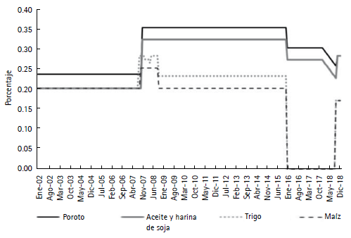 Los complejos sojeros, maiceros y trigueros representan de manera agregada el 40.2 % de las exportaciones argentinas. En particular, se observa una alta preponderancia del sector sojero con énfasis en la harina de soja y el aceite de soja. Cabe mencionar también que desde el año 2002 se reinstalaron los derechos de exportación sobre el complejo sojero, el trigo y el maíz en Argentina. En la figura 2 se muestran las tasas aplicadas para los principales productos de exportación argentino. De acuerdo con Thomasz et al. (2019) los derechos de exportación representaron en promedio el 9 % de la recaudación fiscal.
