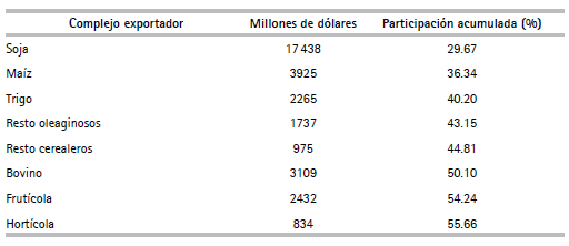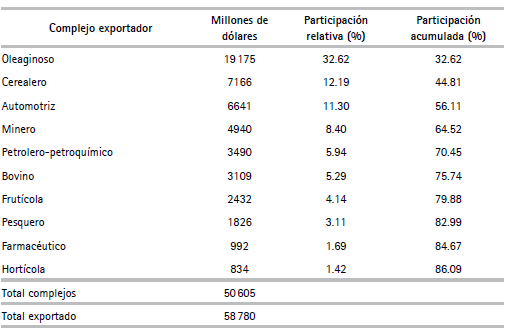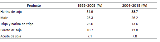 Al igual que el agregado de las exportaciones totales argentinas, el portafolio exportador seleccionado tiene una alta concentración en el complejo sojero con el 57.6 % promedio para el período 2014-2018, liderado por la harina de soja con un 39 % del total. Uno de los hechos relevantes que surgen de la comparación entre períodos es la caída en la participación del trigo del 25 % al 13.7 %. Esto se explica, en parte, por el aumento en la cantidad de productos derivados de la soja exportados como consecuencia del boom de la demanda de China e India. Al mismo tiempo se registra una caída en la participación relativa del trigo en Argentina sobre el total 5.