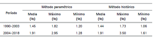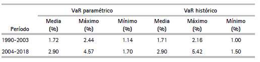 Siguiendo la metodología planteada se presenta primero el resultado del VaR para el propio portafolio exportador seleccionado y luego se lo expresa como porcentaje del total exportado. El promedio para el período 1990-2003 fue del 1.45 % y del 1.91 % para el período 2004-2018 para la estimación para-métrica y se obtienen promedios similares en el método histórico como se observa en el cuadro 4. Ambos resultados son expresados en frecuencia diaria. Se observa un incremento del VaR del portafolio exportador en el segundo rango temporal asociado con el período de financiarización de mayor volatilidad. Los resultados aquí encontrados son concordantes con lo esperado en la revisión bibliográfica. Se destaca también que los resultados son robustos para la metodología utilizada, ya sea paramétrica o histórica.
