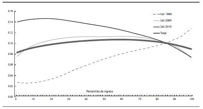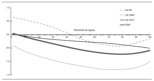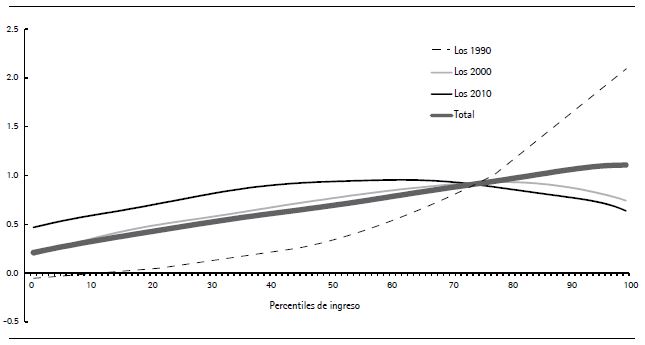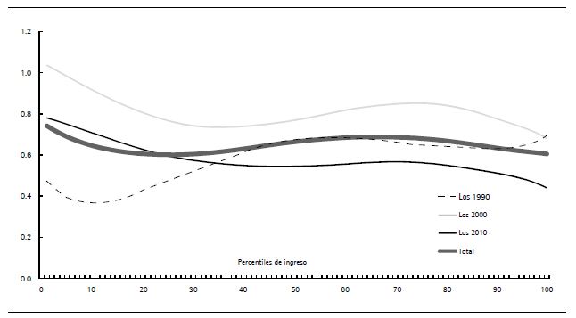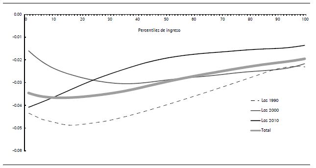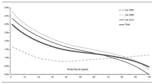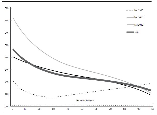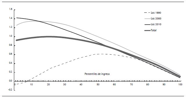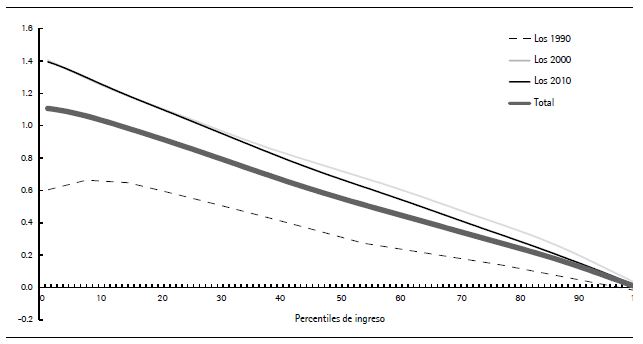 La dinámica de aumento fue diferente entre décadas. En la década de 1990, el crecimiento de los ingresos fue débil y creciente en el percentil de ingresos (a partir del percentil 24). En contraste, el crecimiento fue pro-pobre en los 2000 y 2010: las CIC de ambos periodos fueron decrecientes en el percentil de ingreso, aunque este perfil fue más marcado en los 2000 que en la década siguiente. Como consecuencia de estos patrones, en el agregado del periodo la CIC global resulta decreciente: los ingresos reales han aumentado en las últimas tres décadas, en mayor proporción en los estratos de menores ingresos. El ingreso real creció al 4.2 % anual en el decil 1; al 2.9 % en el decil 2; y así a tasas decrecientes hasta 1.4 % en el decil superior10.