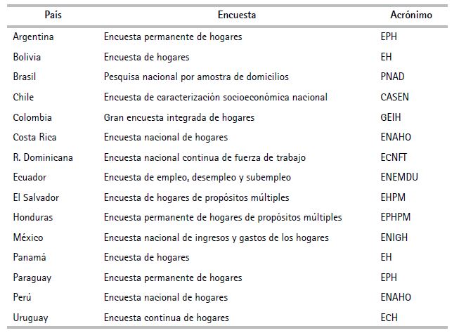 Las encuestas de hogares no son uniformes en los países de América Latina y, en la mayoría de los casos, ni siquiera dentro de un país, a lo largo del tiempo. Debido a esa situación, se hacen todos los esfuerzos posibles para hacer que las estadísticas sean comparables entre países y en el tiempo, por lo que se utilizaron definiciones similares de variables en cada país y cada año, aplicando métodos consistentes de procesamiento de datos5. El cuadro 1 lista las encuestas de hogares utilizadas en el trabajo. Se incluye información de todos los países de América Latina, con excepción de Guatemala y Nicaragua, que realizan encuestas comparables de forma esporádica, y Venezuela, donde la información reciente se ha vuelto difícil de obtener.