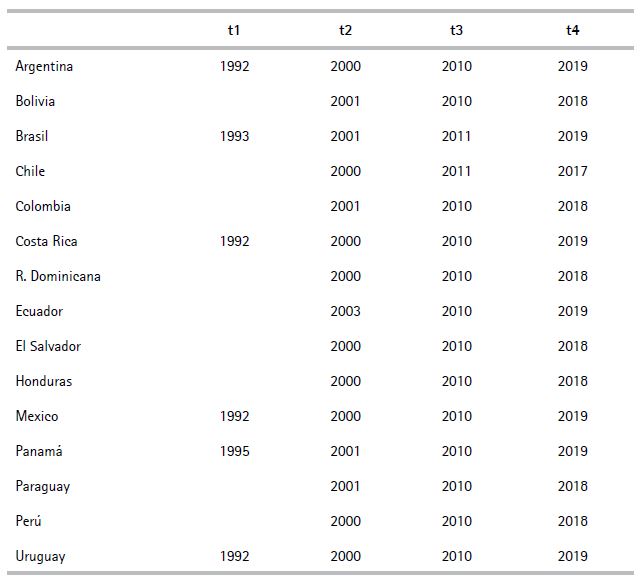 Los indicadores de las décadas de 2000 y 2010 se construyen sobre la base de información de casi todos los países de América Latina (quince países, cuadro 1), salvo excepciones indicadas, cuando no existan datos para alguna variable en algún país. En cambio, la información en la década de 1990 se construye sobre datos de las encuestas nacionales de hogares de Argentina, Brasil, Costa Rica, México, Panamá y Uruguay, dado que la información para comienzos de 1990 en el resto de los países es inexistente o poco comparable con la de principios de los 20009. Los países considerados en esa submuestra representan el 65 % de la población total de la región.
