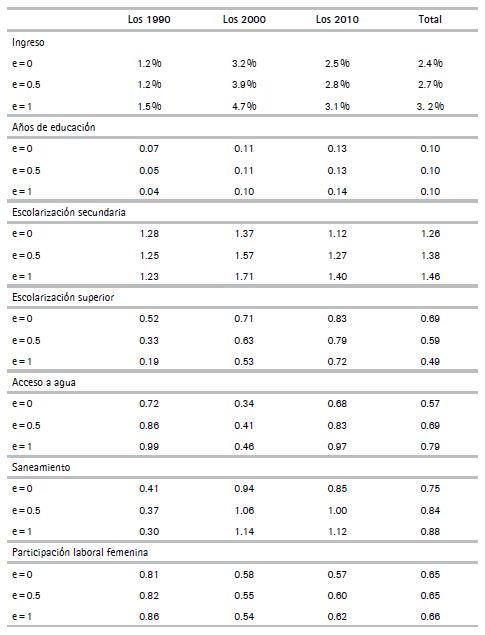 En la sección anterior analizamos el crecimiento en las variables de interés a lo largo de toda la distribución del ingreso. Las tasas de crecimiento ponderadas discutidas en la sección 2 son herramientas para resumir esa información, incluyendo valoraciones diferenciales según el lugar de la distribución donde se producen los avances. El cuadro 3 muestra el promedio entre países de las tasas de crecimiento (o cambios por año) ponderadas de cada una de las diez variables analizadas, para las tres décadas, para tres valores alternativos del parámetro e en la ecuación (5). El valor e = 0 refleja una estructura de ponderadores idéntica por percentiles, mientras que valores más elevados de . representan estructuras con ponderadores más altos en los percentiles de ingresos más bajos, como se discutió en la sección 2.