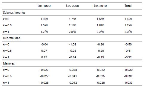 La caída en la tasa de informalidad de los trabajadores, mayor en la década de los 2000, no estuvo concentrada en los estratos más bajos. Por esta razón, la evaluación de la disminución en esta variable se desacelera con el aumento de la ponderación en los más vulnerables. De hecho, para los 1990 la informalidad aumenta, si asignamos mayor peso a los cambios ocurridos entre los trabajadores más pobres (-0.04 con e = 0; 0.15 con e = 1).