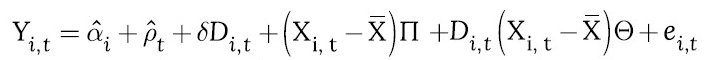 (8)Donde δ refleja el efecto promedio del tratamiento para los tratados ( ATET), D i,t representa un indicador que toma el valor 1 si el país implementa un consejo fiscal en el año t y toma el valor 0 si no implementa un consejo fiscal, recoge los efectos no observables por país, recoge los efectos no observables por año, X i,t representa un conjunto de covariables y representa el promedio de las covariables. Como se observa, la especificación ( 6) no incorpora covariables en el proceso de estimación, mientras que las especificaciones ( 7) y ( 8) sí incorporan las covariables para controlar posibles sesgos en el efecto estimado como resultado de diferencias en las características observables entre los países tratados frente a los países sintéticos que componen el grupo de control. Por su parte, la especificación ( 8) introduce las covariables como desviación respecto a su media y con interacción con el indicador del tratamiento D i,t, lo cual permite recoger el efecto completo de los consejos fiscales bajo posibles heterogeneidades con respecto a los movimientos en las covariables (véase Imbens y Rubin, 2015; Negi y Wooldridge, 2021; Wooldridge, 2021).