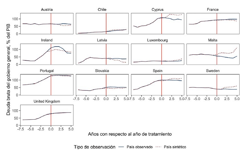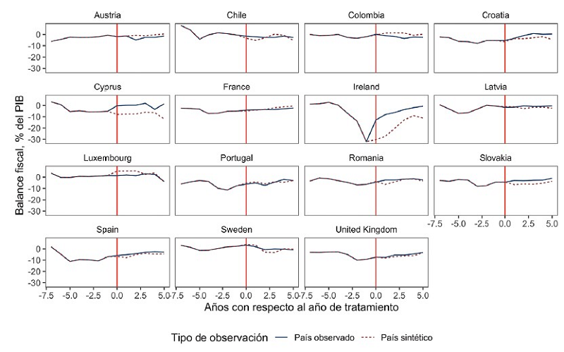 En síntesis, el procedimiento de dos pasos descrito consiste en la emulación de una investigación experimental mediante la estimación de contrafactuales para cada país con consejos fiscales, de tal forma que para cada uno de estos se tenga parejas de observaciones relacionadas con la presencia y con la ausencia de los consejos fiscales, para con ello proceder a estimar los efectos causales promedio de los consejos fiscales para el grupo de países que efectivamente ha puesto en marcha esta institución. Este procedimiento posee algunas ventajas en materia de identificación de efectos causales. Primera, al garantizar la similitud de los países sintéticos con los observados antes de la introducción del tratamiento, se maximiza la probabilidad de establecer un grupo de control altamente comparable con aquellas unidades para las cuales se desea determinar el efecto causal de una intervención. Esta mayor comparabilidad garantiza el cumplimiento del supuesto de tendencias paralelas requerido para obtener estimaciones de diferencia en diferencias (o estudio de eventos) precisas (véase Roth et al., 2022 ).