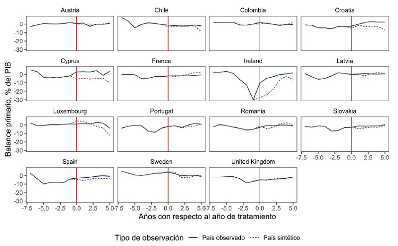 Como se detalló en la exposición de la estrategia econométrica, el primer conjunto de estimaciones consistió en la construcción de países sintéticos. Para evaluar que los países sintéticos efectivamente reprodujeran el comportamiento de los países con consejos fiscales en ausencia de esta institución, se comparó la evolución de las variables de gestión fiscal de los países sintéticos con la de los países observados. Los resultados de estas estimaciones se muestran en las figuras 1, 2 y 3, que plasman la evolución de la deuda, el balance primario y el balance consolidado (todas como porcentaje del PIB), respectivamente; tanto antes de la introducción de los consejos fiscales (espacio a la izquierda de la línea roja), como después de su instauración (espacio a la derecha de la línea roja). Como se plasma en dichas figuras, la evolución de los indicadores de desempeño fiscal antes de la instauración de los consejos fiscales es equivalente entre los países observados y sintéticos. Este resultado favorece el cumplimiento del supuesto de tendencias paralelas, el cual es necesario para identificar efectos causales mediante una estrategia de estimación de diferencia en diferencias o estudio de eventos. Por su parte, a pesar de que estas pruebas sugieren que no es necesario realizar un ajuste de regresión con covariables, se optó por hacer dichos ajustes según lo planificado, dado que ello tiende a aumentar la eficiencia de las estimaciones.