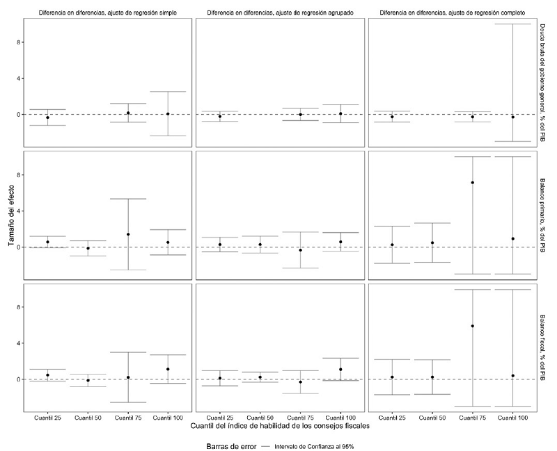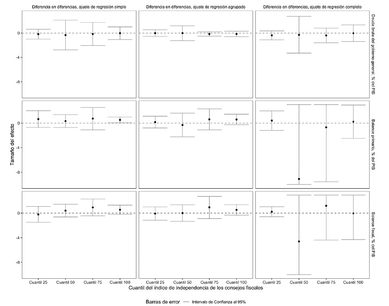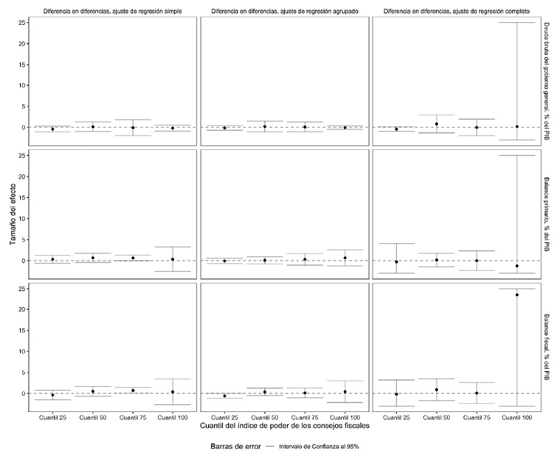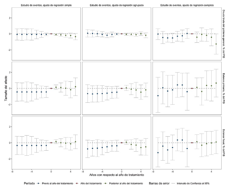Por su parte, si bien no se identificaron efectos significativos de los consejos fiscales sobre los niveles de endeudamiento y balance fiscal consolidado (todos como proporción del PIB), el reconocimiento de efectos positivos sobre el balance primario y la observación de coeficientes estimados con el signo esperado para estas variables apuntan hacia la posibilidad de observar efectos en el largo plazo. Dado que la muestra utilizada en las estimaciones de efectos promedios solo incluye una ventana de tiempo de cinco años posteriores a la instauración de los consejos fiscales, puede que no haya sido posible detectar los efectos significativos de mayor plazo a pesar de haber detectado impactos de corto plazo sobre el balance primario. Además, si se considera que en el largo plazo los niveles de endeudamiento dependen altamente de la sucesión de déficits primarios en el tiempo, resulta razonable que sea posible obtener una reducción importante del endeudamiento en el largo plazo, sobre todo si se da como cierto que el impacto de los consejos fiscales sobre el balance primario es de tamaño moderado a alto, tal como se observó en las especificaciones Ancova.