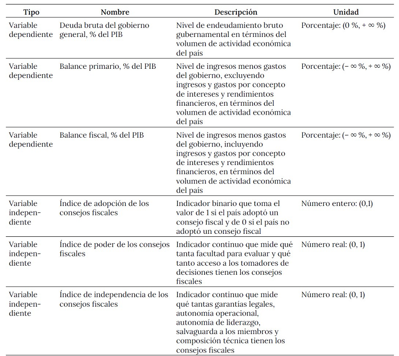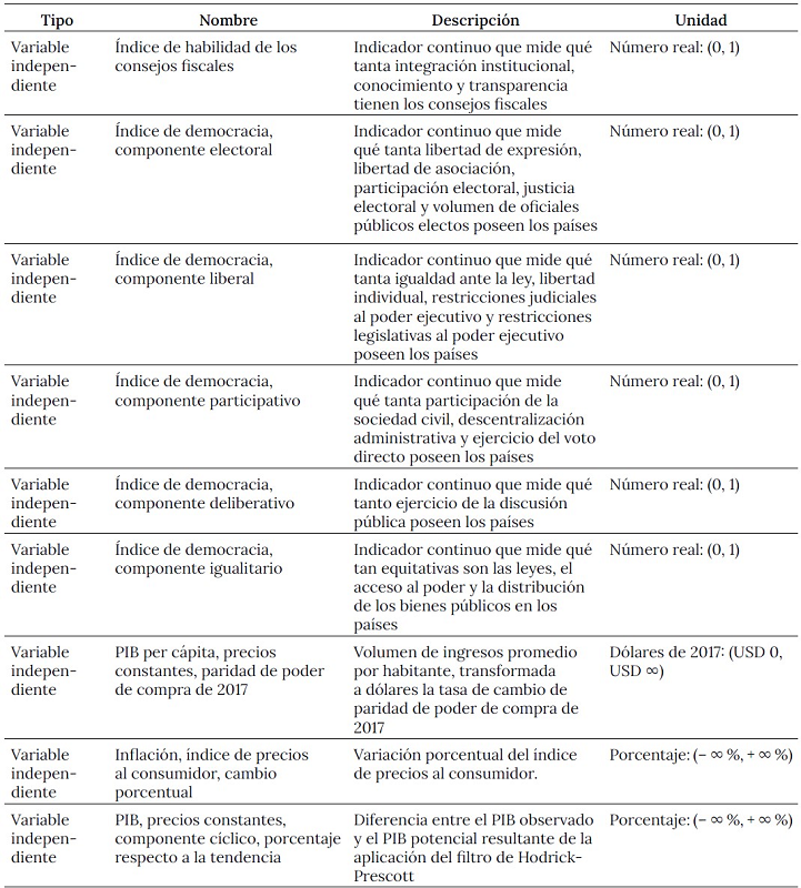 Por otro lado, para medir el grado de avance de las instituciones democráticas en los países analizados, el cual puede condicionar tanto la implementación de los consejos fiscales y sus efectos sobre la gestión fiscal, se usó la base de datos Varieties of Democracy o V-Dem ( Coppedge et al., 2021 ). Esta base de datos recoge el conjunto más amplio de indicadores existentes sobre los aspectos electorales, liberales, participativos, deliberativos e igualitarios de las instituciones democráticas y los agrega en cinco índices compuestos para cada una de las dimensiones señaladas, siendo su utilización ideal para recoger la influencia de los diversos factores de la institucionalidad democrática contemporánea sobre los consejos fiscales y el desempeño financiero de los gobiernos. Por último, los indicadores sobre las condiciones macroeconómicas de los países, que también pueden influenciar la implementación de los consejos fiscales y sus impactos, provienen de la base de datos del World Economic Outlook del Fondo Monetario Internacional. Esta base de datos es una de las principales referencias internacionales sobre la evolución económica de un amplio conjunto de países, recogiendo aspectos como ingresos per cápita, crecimiento de la actividad económica, desempleo e inflación, lo que la convierte en idónea para medir la influencia de los factores de entorno sobre los consejos fiscales y sus impactos.