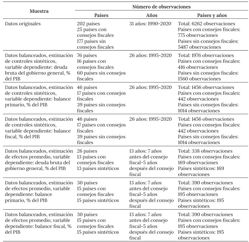 En su estado original, la muestra considerada en este trabajo se compone de 6262 observaciones, correspondientes a 202 países en el periodo 1990-2020. Sin embargo, la falta de valores para algunos de los indicadores seleccionados motivó la no consideración de los países sin datos completos para las variables analizadas. Esto, junto con el procedimiento de estimación descrito en la sección anterior implicó la configuración de diversas muestras, cada una de ellas asociada a la fase de estimación y variable dependiente considerada. Como se observa en el cuadro 2, el procedimiento que se usó conllevó la consideración de solo 76 países para la estimación de controles sintéticos para la deuda bruta del gobierno fiscal de los países con consejos fiscales y la utilización de solo 46 países para la estimación de controles sintéticos para las variables de balance primario y balance fiscal consolidado de los países con consejos fiscales.