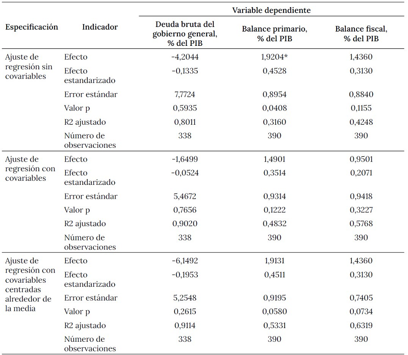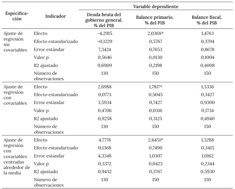 A pesar de observarse efectos sobre el balance primario, las estimaciones muestran la inexistencia de efectos estadísticamente distintos de cero asociadas al resto de variables dependientes analizadas. Estos resultados son parcialmente coherentes con los arrojados por las especificaciones de diferencia en diferencias, puesto que en este caso sí se identifican efectos significativos sobre el balance primario. En este punto conviene recordar que, tal como demuestra McKenzie (2012), las especificaciones de Ancova tienen mayor capacidad para detectar efectos causales en comparación con las especificaciones de diferencia en diferencias, específicamente en contextos de baja autocorrelación de las variables dependientes. En este sentido, si se toma en consideración que los coeficientes de autocorrelación de la deuda, el balance primario y el balance fiscal consolidado (todos como proporción del PIB) son de 0.88, 0.64 y 0.63, respectivamente; luce razonable considerar que estas estimaciones puedan ser marginalmente superiores a las de diferencia en diferencias en lo que respecta a la identificación de los efectos causales sobre el balance primario y el balance fiscal consolidado.