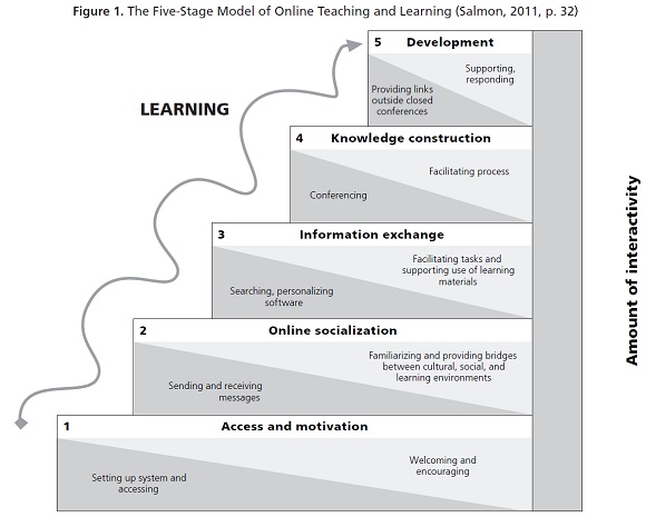 At stage 1 individual access and the ability of participants to use online learning are essential for group learning to develop. Stage 2 involves individual participants establishing their online identities and finding others with whom to interact. At stage 3, participants give each other information relevant to the course. This stage is characterized by cooperation and support for each person’s goals. At stage 4, group discussions start and the interaction becomes more collaborative. At stage 5 participants use the system to achieve their goals, seek to integrate online into other forms of learning and reflect on their learning process. Each stage requires the participants to master certain technical skills, in the bottom left of each step, as well as e-moderating skills, on the right top of each step. The levels of interactivity, shown in the “interactivity bar” that runs along the flight of the steps, also increase and the kind of information and messages that the participants exchange also change through the steps and the stages of the model. (p. 32-33)