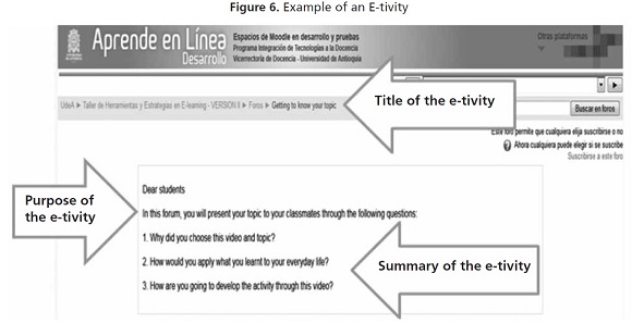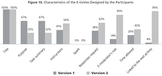 During the first time the course was offered, just 38% of the e-tivities designed indicated what the e-moderator should do and, remarkably, 62% in the second version. Salmon (2002, 2013) argues that e-tivities should clearly state what the e-moderator will do, how and when she/he will do it. For example, summarizing, giving feedback, teaching points, and closing the e-tivity.