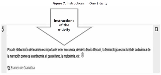 Forty-one percent of the e-tivities designed during the first version of the course had instructions and 59% of them had this characteristic during the second version. Salmon (2002, 2013) states that participants in an online course should know in advance what is expected from them and they should be clear on what they have to do and how. Not to include this feature in an e-tivity can generate confusion, despair, and demotivation. Figure 7 shows the instruction included in one of the participant’s e-tivity: to take the exam the student has to consider aspects such as literary theory and terminology of the narrative.