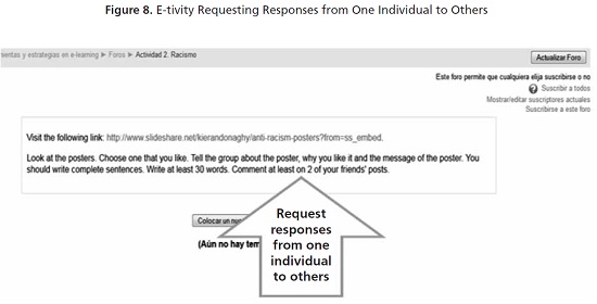 During the first time the course was offered, only 38% of the e-tivities requested responses from an individual to others. In other words, asking participants to react to other participants’ comments or opinions. However, an outstanding 62% of the e-tivities designed during the second version tended to promote interaction among participants by asking them to answer others’ opinions. This might be due to the need of explicitly establishing relationships with others in online environments due to the lack of physical presence (Salmon, 2002, 2013). Figure 8 shows that the participants in a forum must comment on at least two posts from other participants.