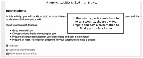 On average, only 35% of the e-tivities in both versions of the course stated the total time allowed for completion, and the estimated total study time for the activity. Salmon (2002, 2013) indicates that to allocate time is important for both e-moderators and students. For e-moderators, time should be abundant, especially if the e-tivities are set for novice learners. For learners, on the other hand, time is crucial because they need it to understand what they have to do and how. Salmon also suggests that e-moderators be highly sensitive to timing and pacing. Finally, during the first version of the course, only 4% of the e-tivities were linked to a future activity. However, during the second version of the course, the instructor placed emphasis on this feature and 95% of the e-tivities showed it. Salmon (2002, 2013) explains that e-moderators can suggest additional resources to help with the completion of the task. She also suggests that e-moderators should indicate whether the resources are required or optional and they should be placed at the end of the e-tivity. Figure 9 shows how one participant linked the resources in one e-tivity.