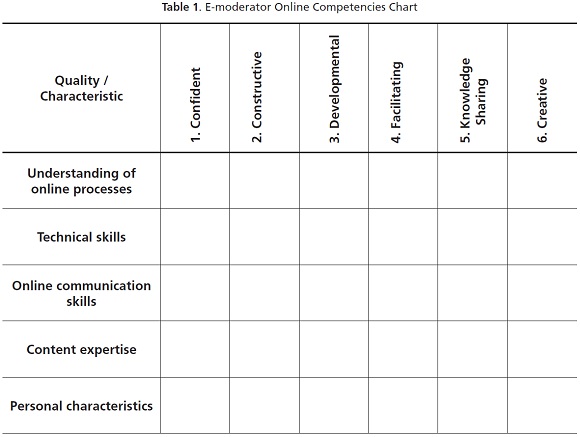 This segment of the paper reports the results from the analysis of the tasks assigned to the participants. Results from Task 1 report the e-moderator competencies. Results from the second task report on e-tivity design and the results from the third task give an account of the strategies and activities the participants may implement in an online course based on Salmon’s (2011) model.