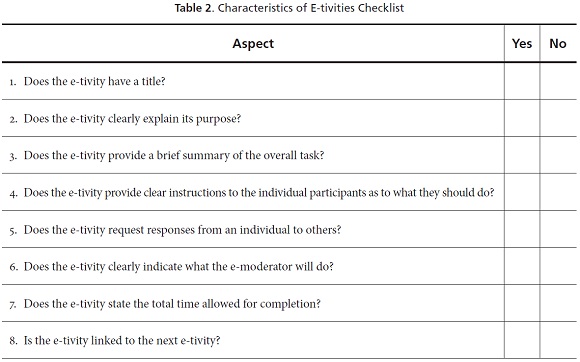 In Task 2, participants had to design an e-tivity. Each participant designed one e-tivity which they published in a space for online assignments submission in the platform and the e-tivities were collected at the end of each course. This task was analyzed using a checklist based on the characteristics of e-tivities: title, a clearly explained purpose, a brief summary of the task, clear instructions for the participants, requested responses from an individual to others, instructions for the e-moderator, total time allowed for the completion of the activity, and link to the next activity as described in Table 2.