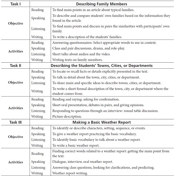 To achieve the research objectives and answer the question of the study I designed and implemented six tasks that included assignments in all skills. This process lasted 20 hours spread across the semester and I took into account the concepts and steps discussed in the literature review. Prior to the application of the tasks, I explained to the participants the methodology to be applied as well as the activities that were going to be completed, so the learners knew in advanced the procedures to be used and the estimated time available for them to fulfill every task. Finally, I shared the decision to work in pairs and I said to them that the topics to be developed were all included in the course program (see Appendix for a description of each of the tasks).