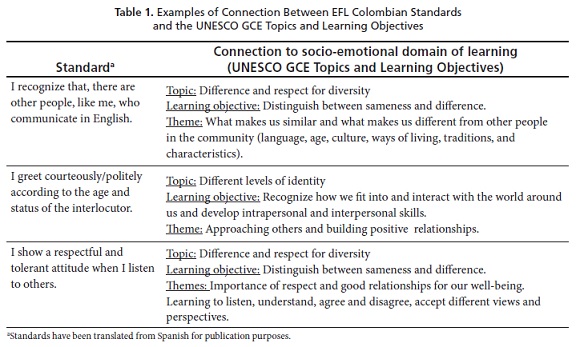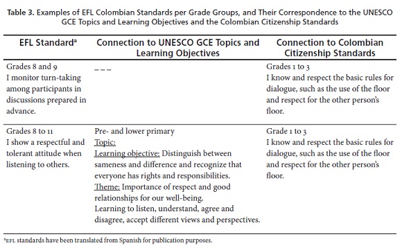 The Colombian EFL standards seem to be more connected to the UNESCO GCE Topics and Learning Objectives than to the Colombian Citizenship Competences. If the purpose of establishing the Colombian Citizenship Competences in 2004 was to permeate all areas of the curriculum, then the connection between these and the specific areas standards should be more visible or explicit.