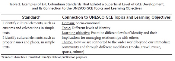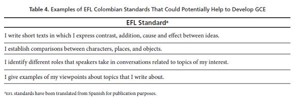 The EFL Colombian standards do not explicitly refer to the development of global citizenship competences. Furthermore, most of the intercultural and critical aspects of learning a language are not considered in the standards. As mentioned before, attention and fulfillment of the standards alone may not contribute to fostering GCE in the English classroom.