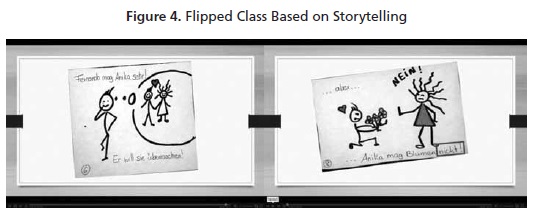 The two examples of videos shown in Figures 3 and 4 reveal this important concept of digital communicative creativity. These pre-service teachers have not only created real-life situations that can be useful for their learners but have also drawn pictures and made up stories to shape dialogues that pursue connecting language with context and communicative skills. The first video (Figure 3) shows a role-play situation at school in which one French student is looking for the library and then the conversation goes on with a selection of target goals. The second video (Figure 4) is creative not only for the story-telling approach these future German teachers have established, but also for the emphasis on language forms, the drawing of the main characters, and the animated voices performed by the team members in order to address the cartoons’ emotions. All in all, the outcome is an amusing and engaging video-story that could attract the attention of young learners.