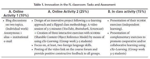 The instructional design for “Innovation” had two components: the structural learning scenarios and the activities. The former, based on a u-learning environment, was supported by the course virtual platform, the discussion forums, and the blog. The latter had a variety of forms: in-class discussions, self-study activities, collaborative learning tasks and online discussions by means of the contributions posted on the blog, and the discussion forums of the Moodle platform. These would-be FL teachers were aimed at dealing with u-learning environments as students first and as pre-service teachers later. They had to face both positions in order to complete the “Innovation” course goals, and therefore, the final product of their contextualised flipped classes.