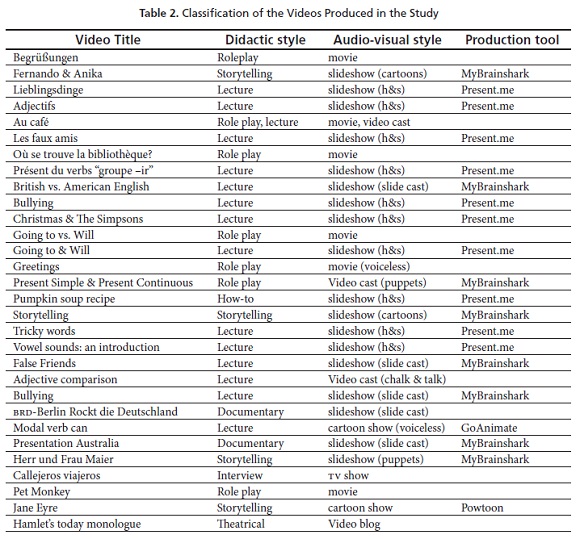A comprehensive list of the 30 videos created by these instructive participants during this teaching practice is presented in Table 2. The videos have been classified into two dimensions: didactic and audio-visual . The didactic dimension involves the use of the narrative or discursive approaches to generate learning: instructional (lecture) and storytelling, for instance, as shown in column “Didactic style”. On the other hand, the audio-visual dimension deals with techniques and tools to display contents on the screen. Column “Audio-visual style” shows the kind of style or genre that is used in each video (slideshow, movie, etc.). The term slideshow is used to mark videos where a PowerPoint-like presentation is being displayed, in combination with some other elements like a small picture of the narrator. This particular style (slides combined with narrator picture) is named “h&s” in Table 2, which stands for “heads and slides”. Another slideshow variant is the slidecast (full-screen slides with voiceover). Finally, the column “Production tool” shows the software tool used for editing and publishing the video. Blank fields mean that the usual recording and editing video software has been used.