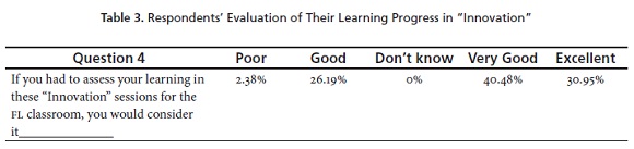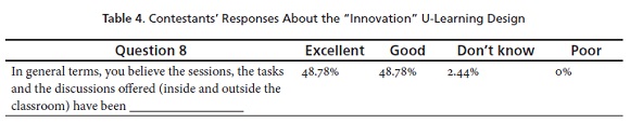 Question 7 dealt with the course evaluation and the correspondence between course content and competences. Most of the participants (89%) considered the assessment not only satisfactory but fair. The remaining respondents mentioned other adjectives such as “varied” and “motivating” to describe the evaluation (9%), and 2% reported that time was too short and did not correspond with the tasks preparation. Finally, Question 8 was especially relevant in this study because it compiled data on the dynamics of the “Innovation” sessions, the tasks and the discussions offered inside and outside the classroom. “Excellent” and “good” were the options equally chosen by 49% of respondents followed by 2% who chose they “did not know” as illustrated in Table 4.